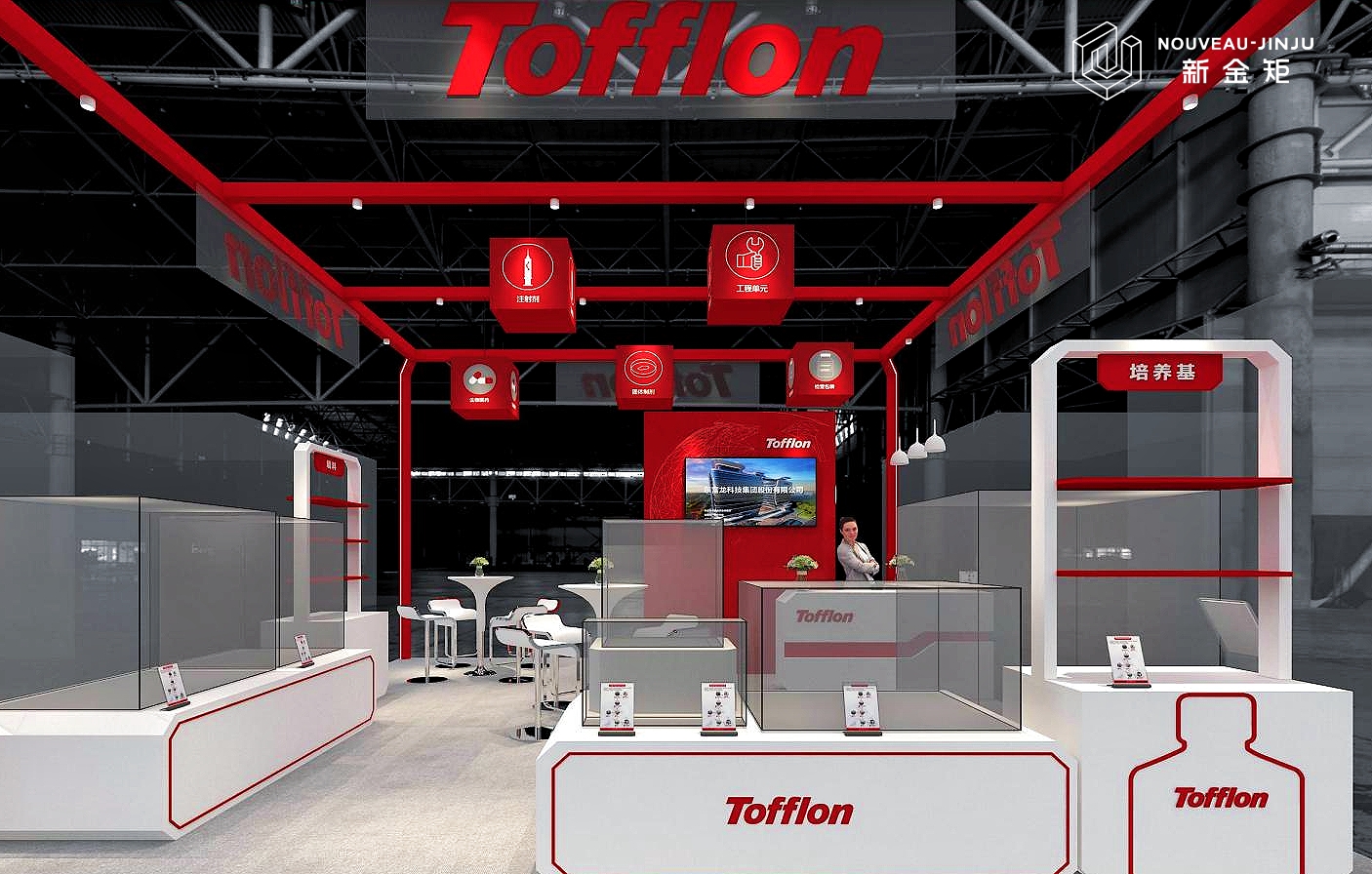 顶部中间悬挂红色装饰盒,上方印刻企业产品。